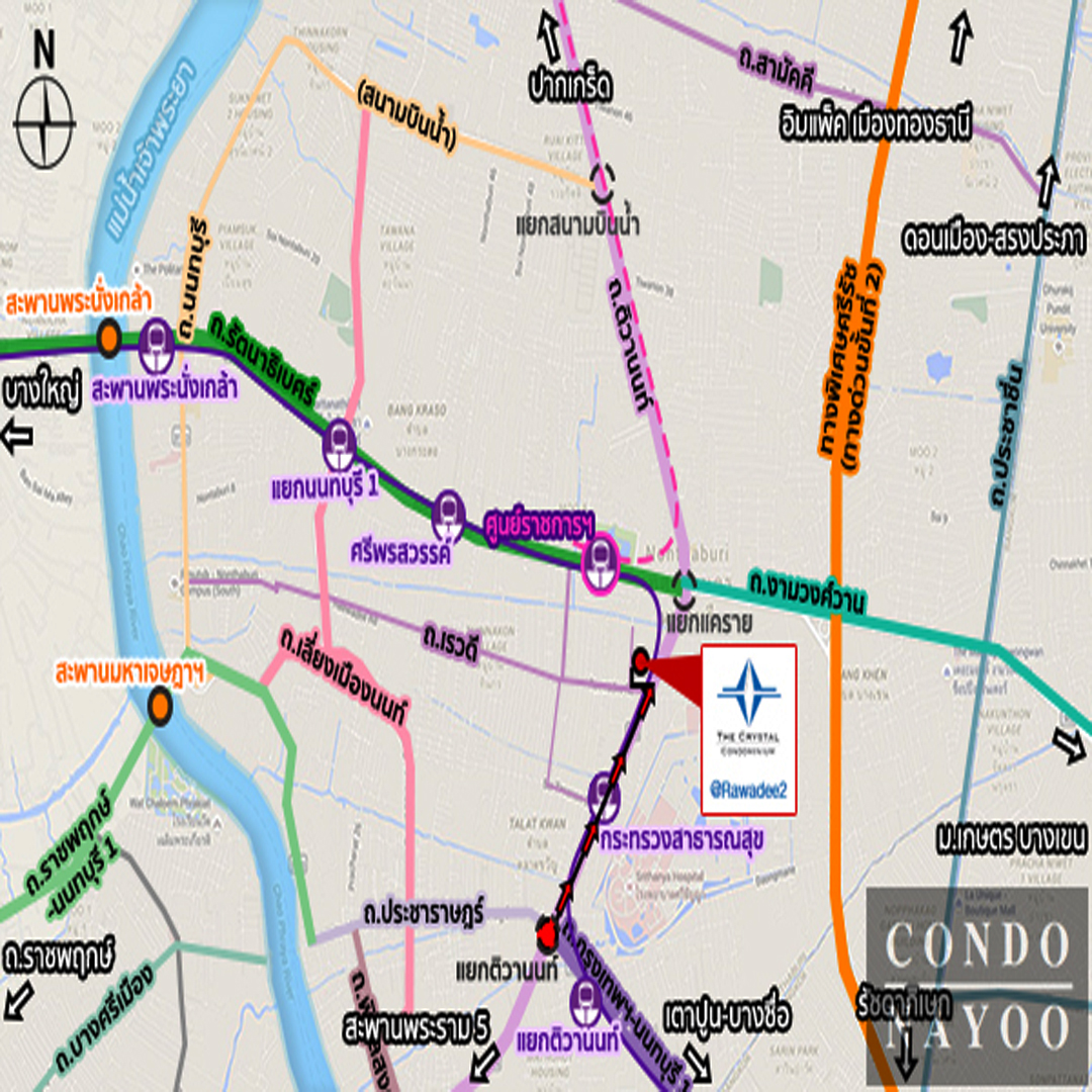 การเดินทางเริ่มจาก แยกติวานนท์ ⇒ ถนนติวานนท์ ⇒ ถนนเรวดี ⇒ ซอยเรวดี 2 ตรงไปอีก 130 เมตรถึงโครงการ The Crystal Condo @เรวดี 2