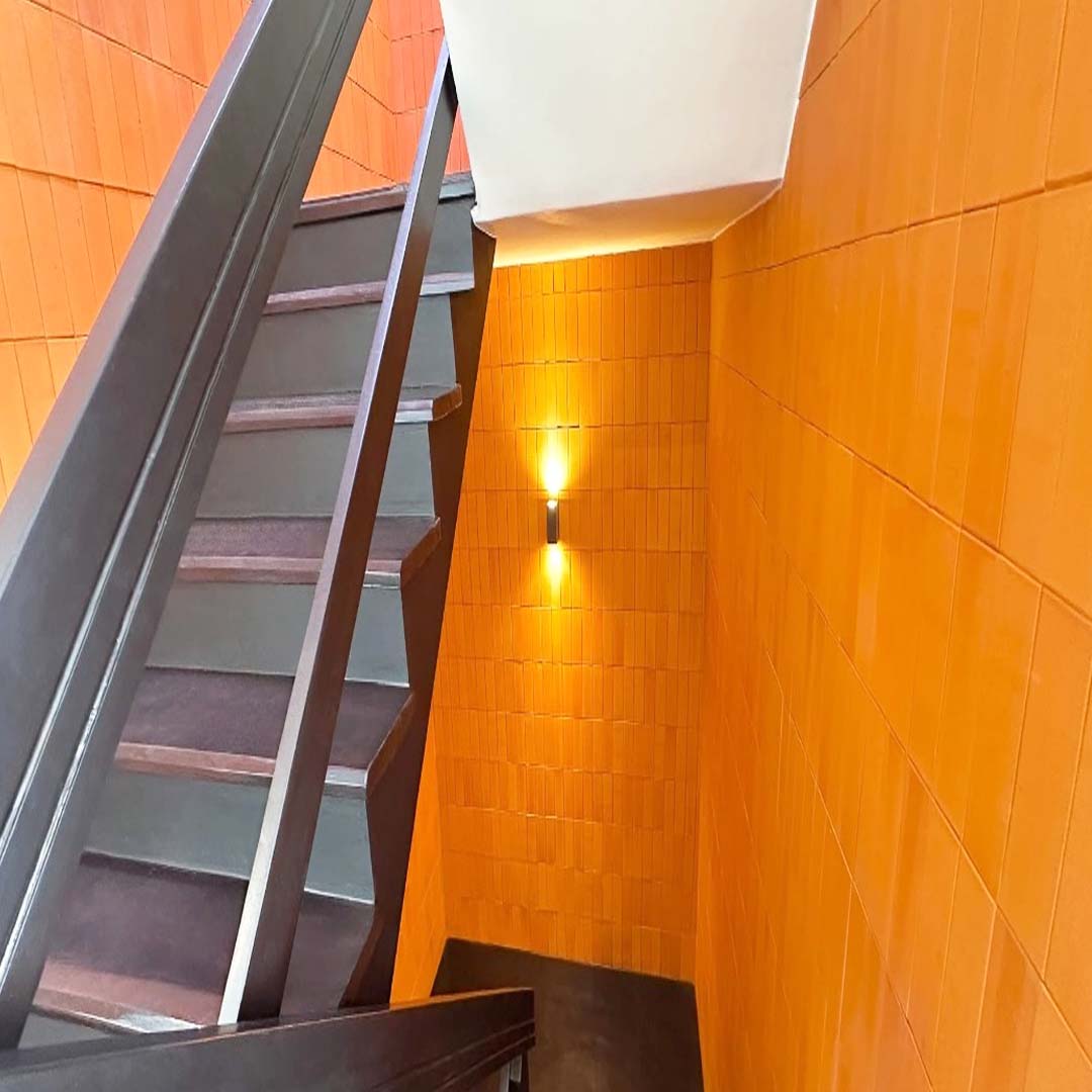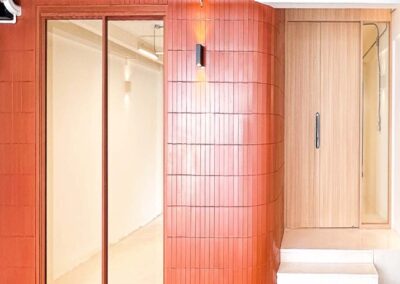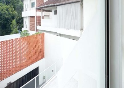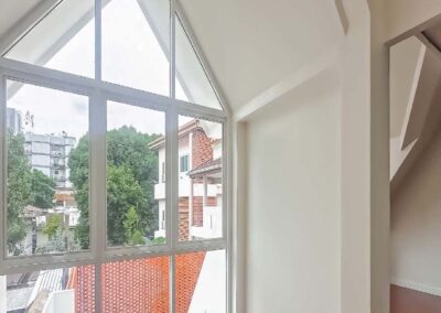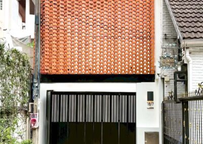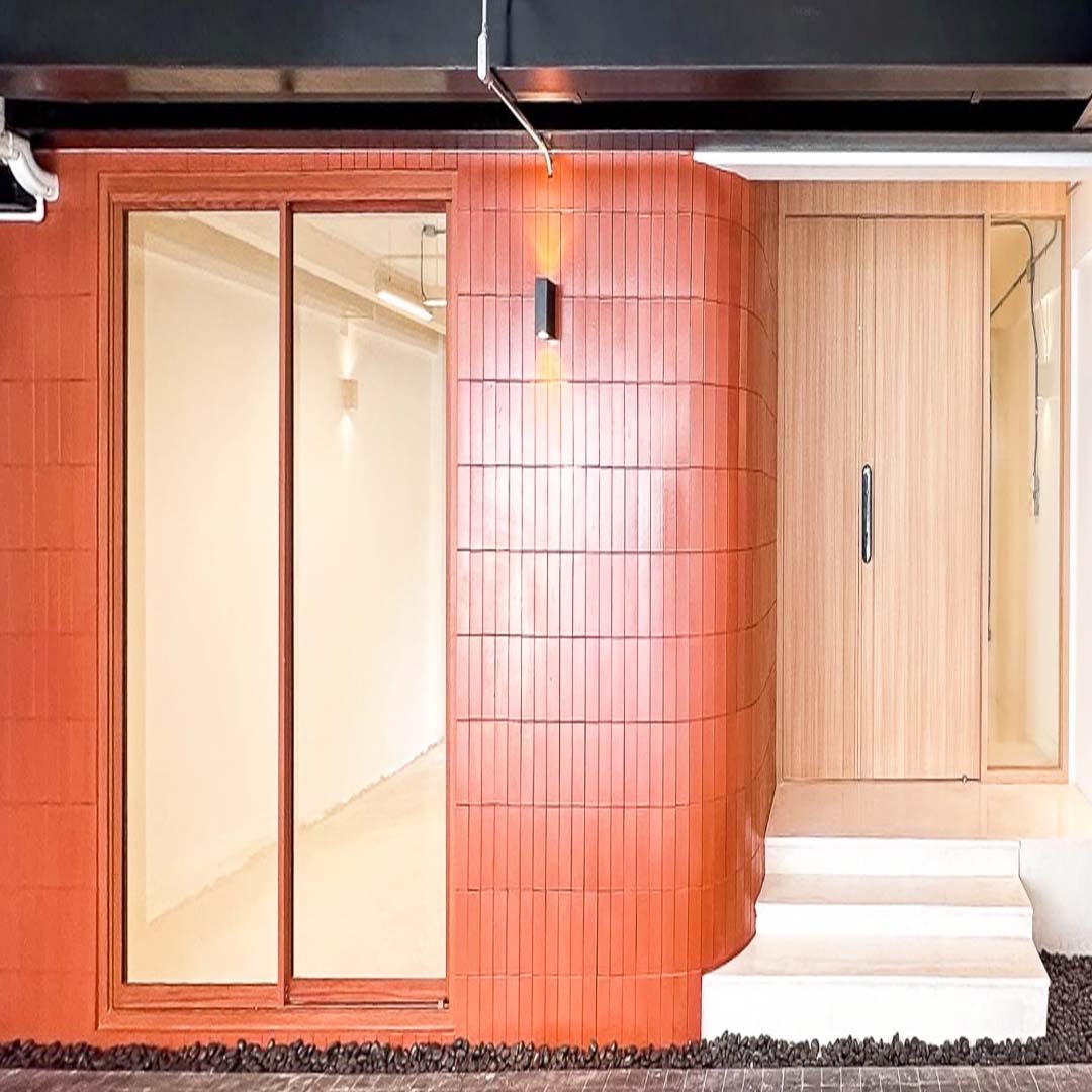 >ผนังอิฐแดงจัดวางอย่างมีศิลปะ ผสานกระจกใสบานใหญ่ โปร่ง โล่ง สว่าง